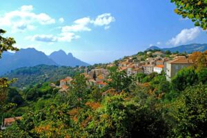 Evisa, a picturesque mountain village nestled in Corsica’s rugged interior near the dramatic Spelunca Gorge.