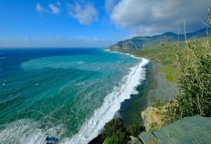 Nonza beach’s contrast of deep blue sea and dark stones creates an unforgettable coastal landscape.