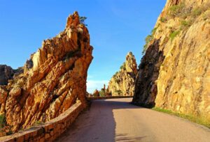 The stunning Calanches route follows a twisting course between narrow passages carved into sheer cliffs.