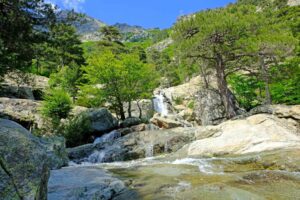 Cascade des Anglais waterfalls form a majestic water-and-granite landscape at the foot of Monte d’Oro in the Vizzavona forest.
