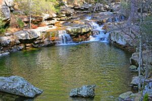 The mountain stream gathers in rocky basins, offering a relaxing pause on a warm day.