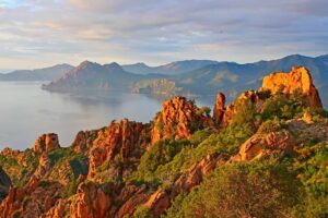 The rugged rocky shapes of the Calanches come alive in the golden hour’s gilded glow.
