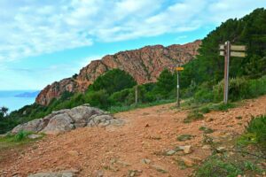 At the small plateau, follow the path towards Vierge des Calanches in the direction of the stone mule trail hugging the rock.