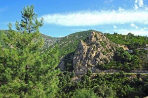 The scenic access road is narrow and windy with tall granite cliffs plunging directly into the cascading Prunelli torrent below.