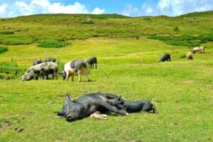 Free-roaming Corsican pigs feel at home on the Coscione’s lush territory.