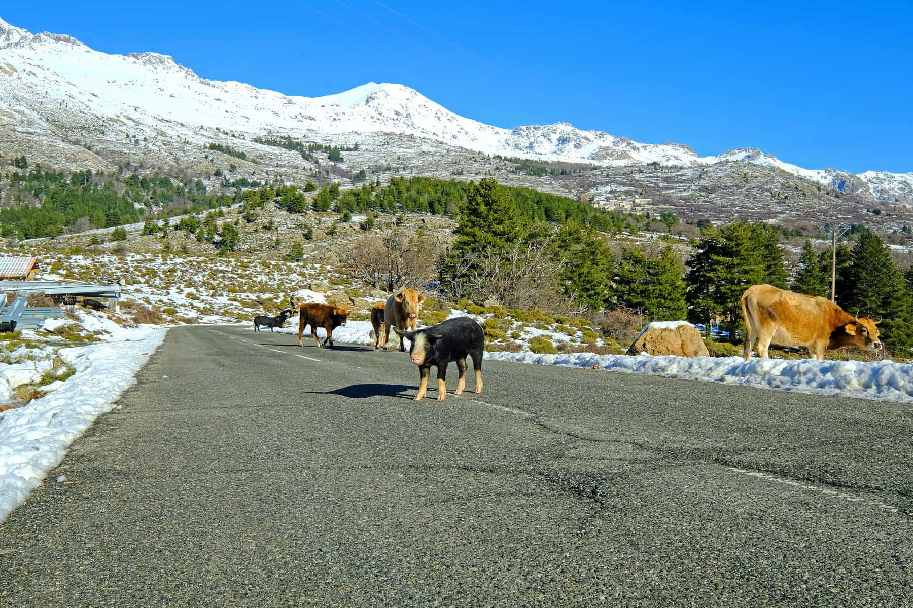 Snow‑covered roads and roaming livestock are part of winter driving in Corsica’s mountains.