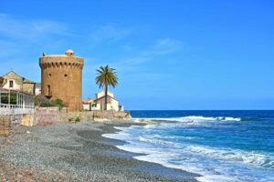 An imposing Genoese watchtower overlooks the atmospheric Miomo beach.